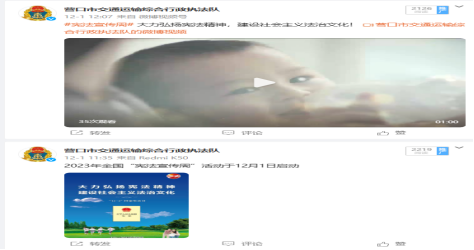 五是“宪法宣传周”期间,通过市交通运输综合行政执法队官方微博发布“国家宪法日”和“宪法宣传周”相关宣传海报、视频10篇;